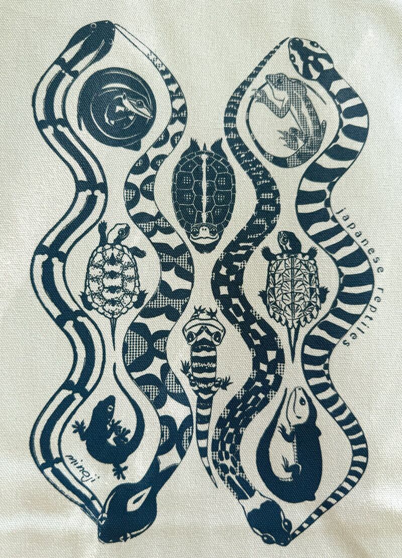 日本の爬虫類達を日本伝統の縁起の良い柄「立涌」のようにデザインしました。 ヒャン、ニホンマムシ、ヤマカガシ、アカマダラ、ニホンカナヘビ、ニホンイシガメ、ニホンヤモリ、ヤエヤマセマルハコガメ、マダラトカゲモドキ、オキナワキノボリトカゲ、リュウキュウヤマガメ、キシノウエトカゲが登場しています。 ▪️サイズ タテ約370mm× ヨコ約330mm× マチ約120mm ▪️素材 綿100% ▪️厚み 8.3oz #japanesereptile