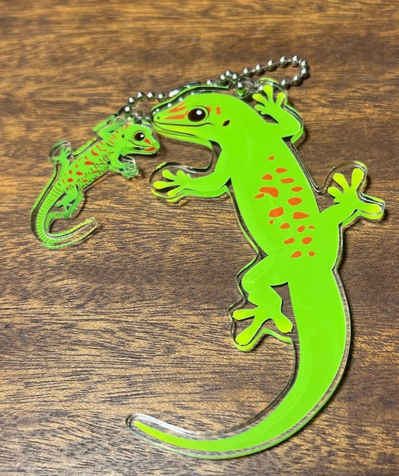 グランディスヒルヤモリの大きめキーホルダー。 親は表がノーマルタイプ、裏がクリムゾンタイプ、 両面プリントです。 ▪️素材 アクリル ▪️大きさ 親 約60mm×約90mm 子 約25mm×約40mm