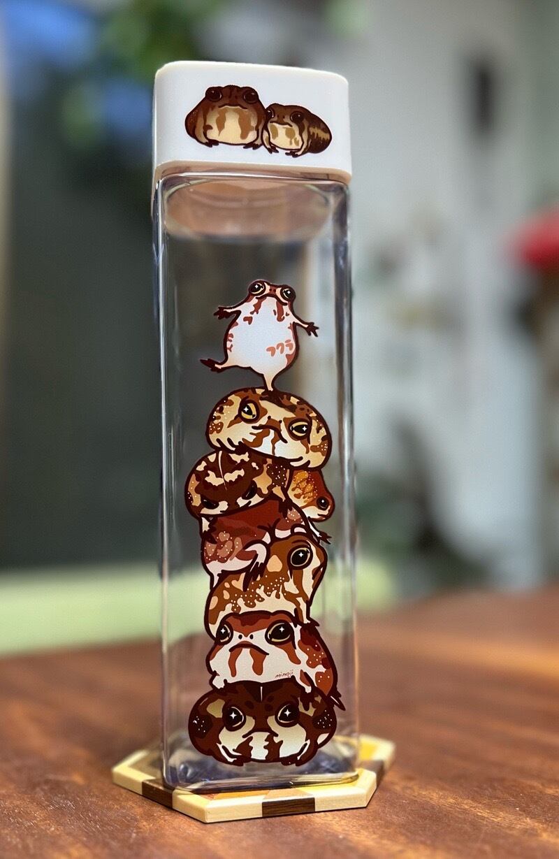 ふっくらもちもちアメフクラガエルたちのクリアボトルです。 お好きなお飲み物を持ち歩くのにお使いください。 コレクションケースとして使われている方もいらっしゃいます♪ ▪️サイズ 約55mm×200mm×55mm ▪️容量 500ml ▪️本体素材 AS樹脂 耐熱80℃