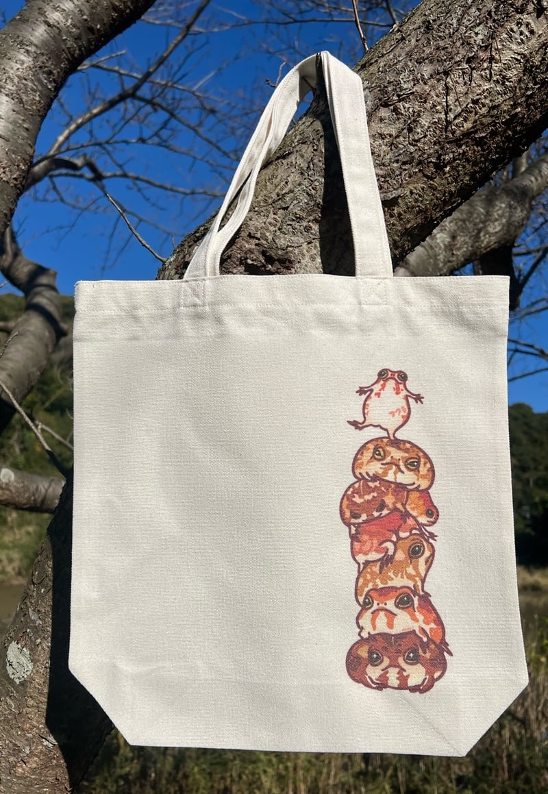 むちむちなアメフクラガエルが積み上がったデザインのバッグです。 ▪️サイズ タテ約370mm× ヨコ約360mm× マチ約110mm ▪️素材 綿100% ▪️厚み 12oz ▪️容量 10ℓ
