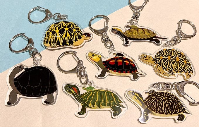 亀の親子がモチーフのキーホルダーです。 セマルハコガメ、ニホンイシガメ、ホウシャガメ、アルダブラゾウガメ、ミシシッピアカミミガメ、フロリダハコガメ、インドホシガメ ▪️大きさ 50mm×50mmくらい